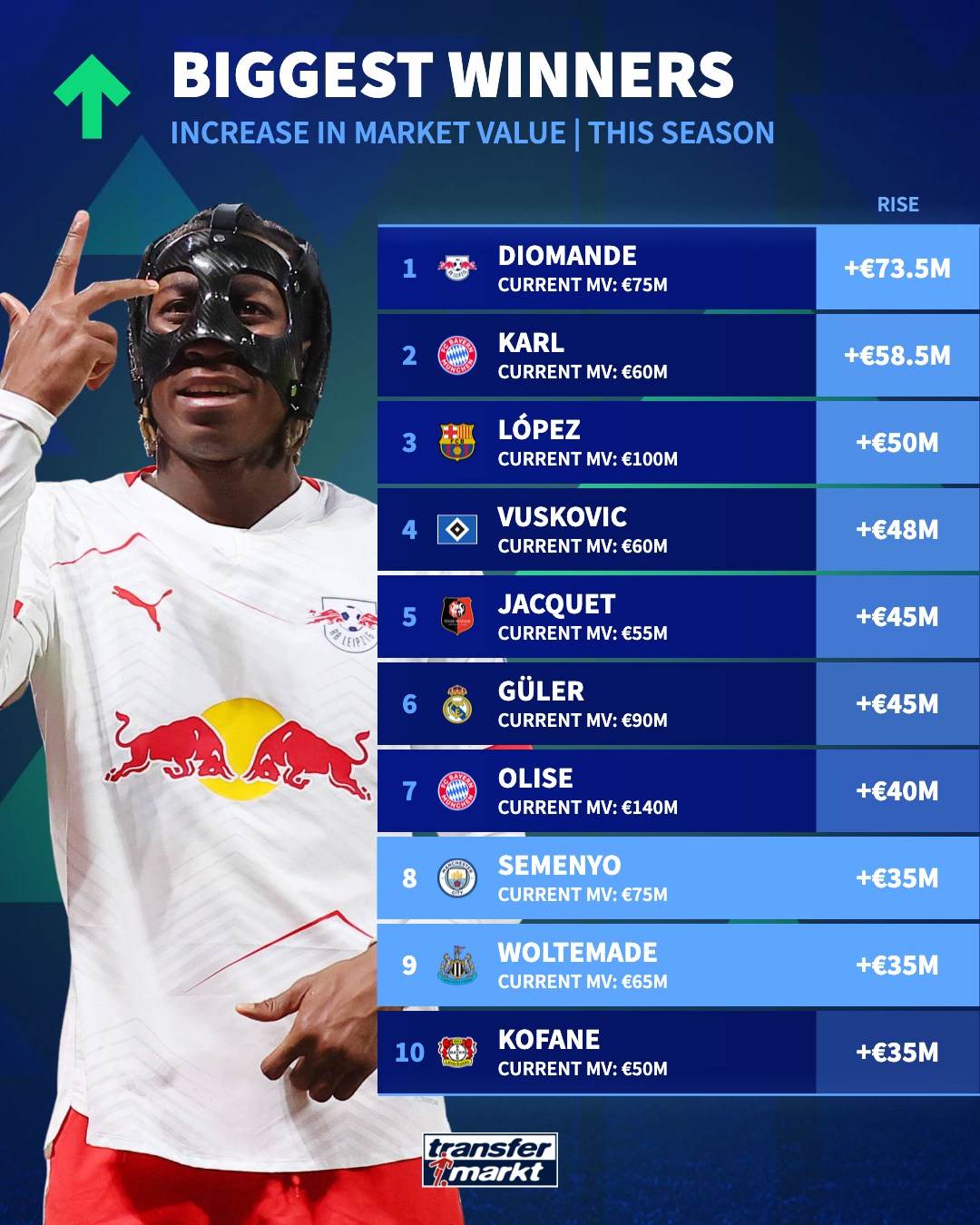 本赛季身价涨幅TOP10:迪奥曼德、卡尔前2,费尔明翻倍到1亿